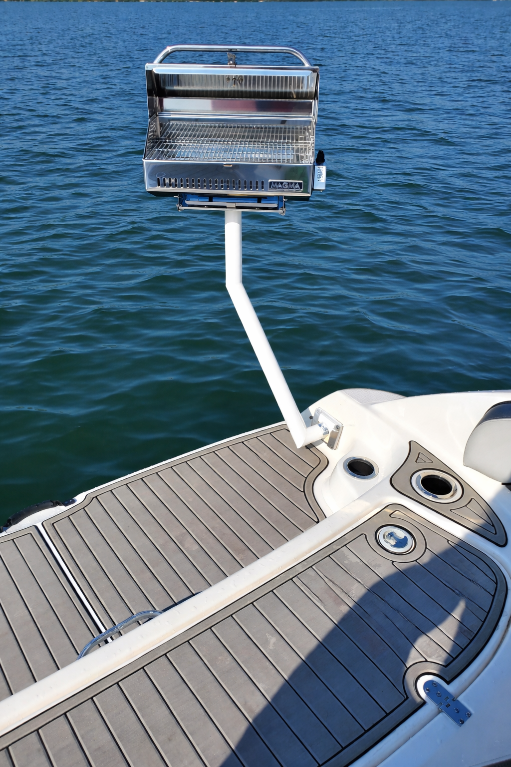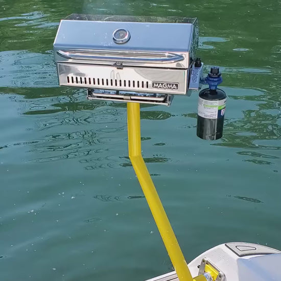 The JEWLS* Customs Stainless Grill Stanchion is a stainless steel leg that has been designed and manufactured to support a grill off of the rear of your boat with the aft table mount either on the port, transom, or starboard side. It puts the grill out over the water so that any grease drippings do not wind up on the boat.