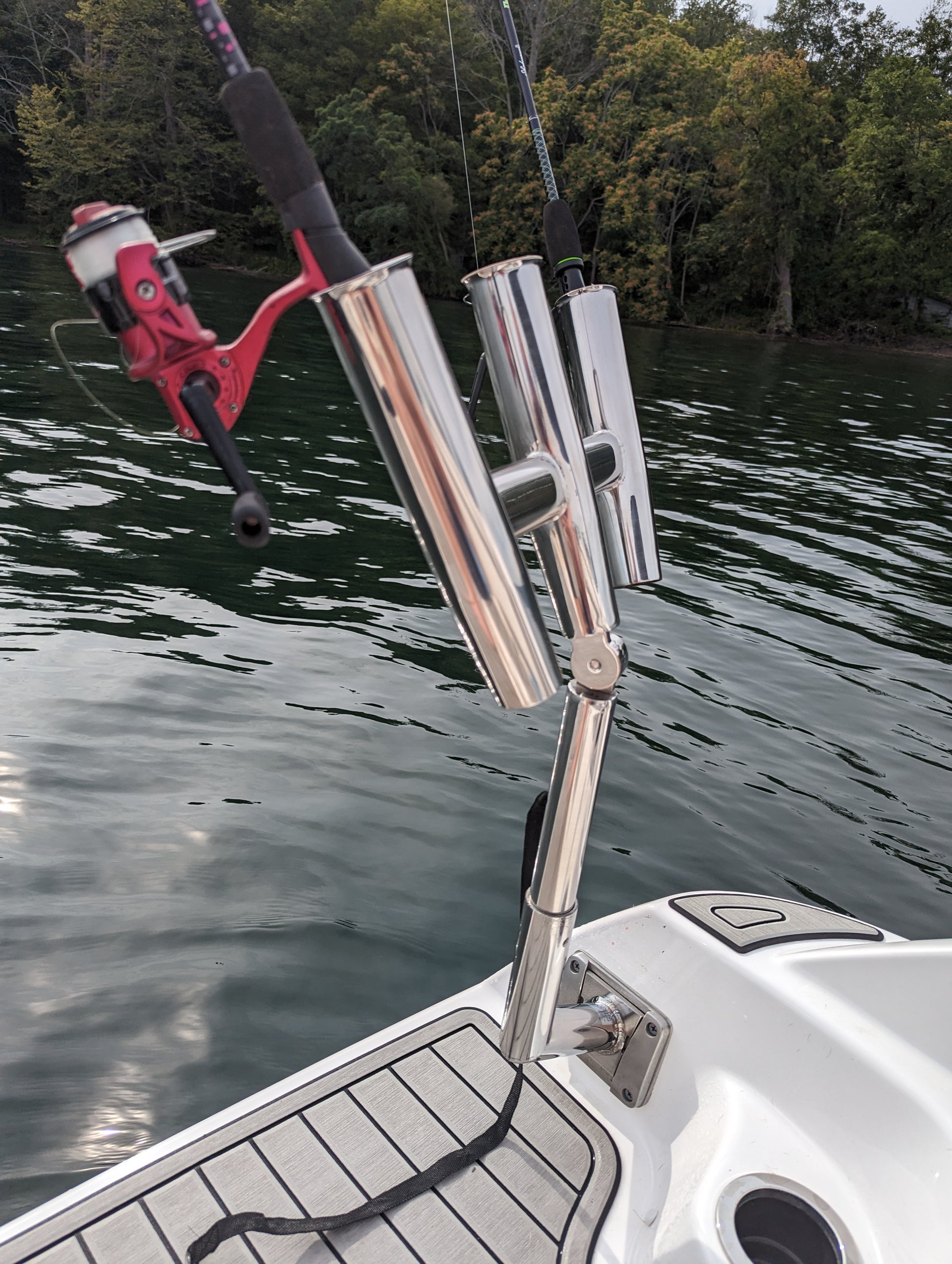 The JEWLS* rod holder mount is a stainless steel fabricated piece that is TIG welded by hand and is polished by hand (there may be a few small blemishes) but it's one of a kind! The mount stands off 6" from the Garelick mount, and extends 6" upward, has an inside diameter of 1.50". The triple gang stainless rod holder is a purchased item, and is included with the bundle.